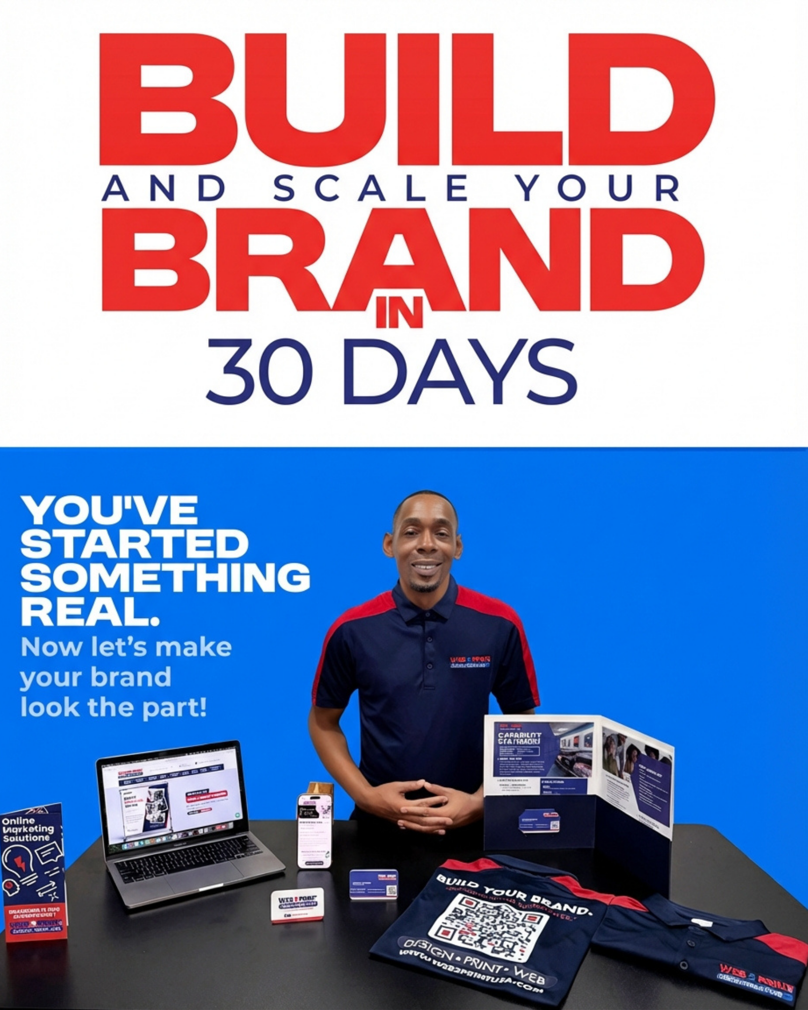 We move fast. You'll have your full brand—logo, landing page, print materials, and apparel—delivered in 30 days or less.